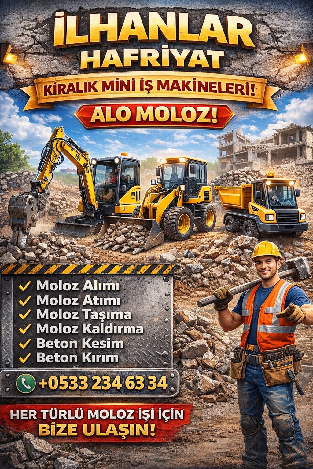 Moloz alımı, moloz taşıma ve kırım yıkım işlerinizde aynı gün servis imkanı sunuyoruz. Alo moloz hattımız ile hızlı dönüş yaparak işlerinizi geciktirmeden tamamlıyoruz.